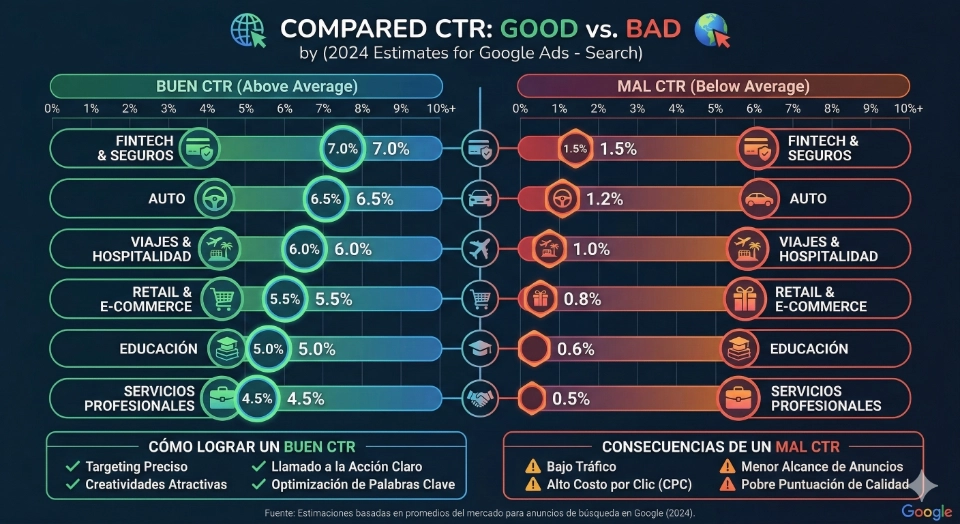 - Búsqueda (Google Ads): El promedio suele rondar el 2% - 5%. Un CTR superior al 6% se considera excelente en la mayoría de los sectores.